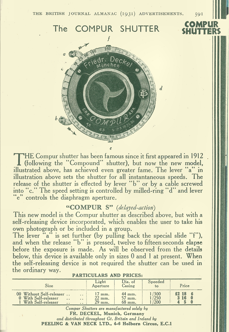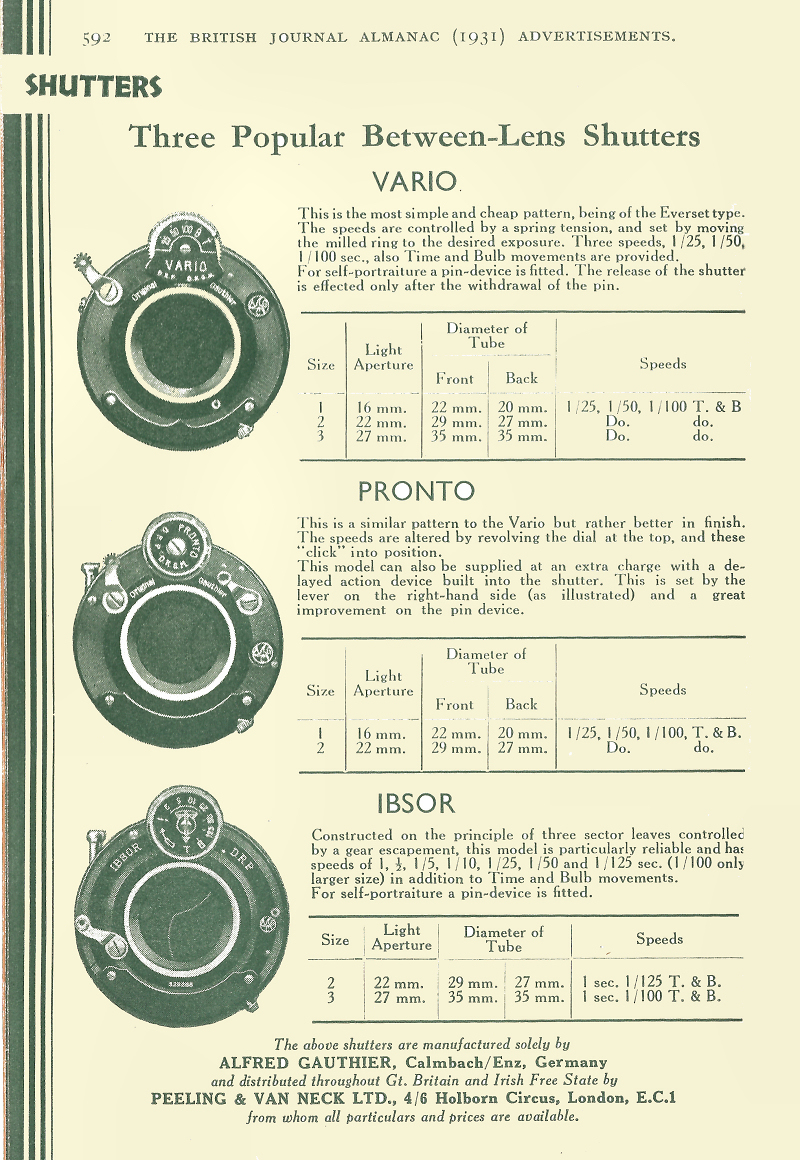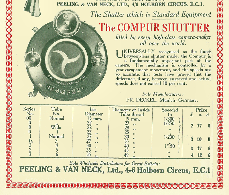 From the Peeling and Van Neck 1931 BJP Almanac adverts. They were the UK distributors of Deckel and Gauthier shutters.